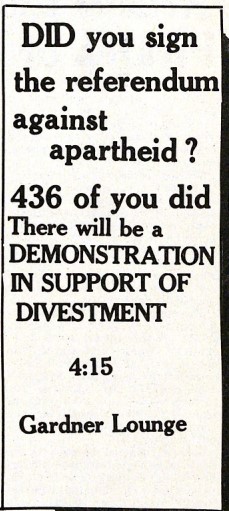 - "S&B Ad: "DID you sign the referendum against apartheid?"", Student Activism at Grinnell, Grinnell College